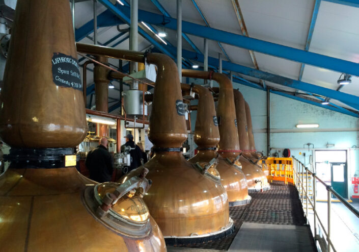 Laphroaigs särart formas redan innan destillationen börjar. Vattnet från Kilbride Stream passerar genom torvmarker rika på förmultnad vegetation från både hav och hed. En del av malten produceras fortfarande i destilleriets egna golvmälterier, där torv eldas för hand under lång tid och vid låg temperatur. Den kalla röken – peat reek – impregnerar kornet med fenoler och tjärämnen som senare följer med hela vägen in i destillatet. Destillationen sker långsamt och med ovanligt sena skärningspunkter, vilket bevarar de råa, örtiga och medicinala tonerna i spriten. Resultatet är ett destillat som redan från början är kraftfullt och maritimt, snarare än mjukt och fruktigt.